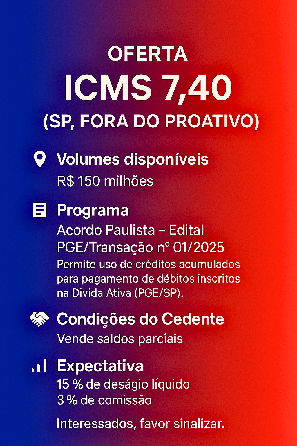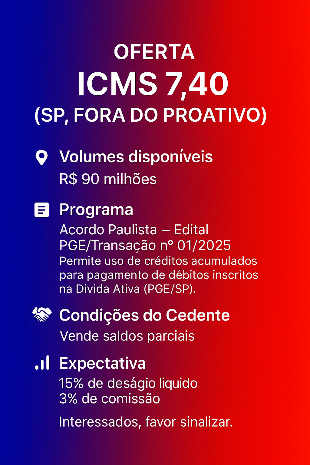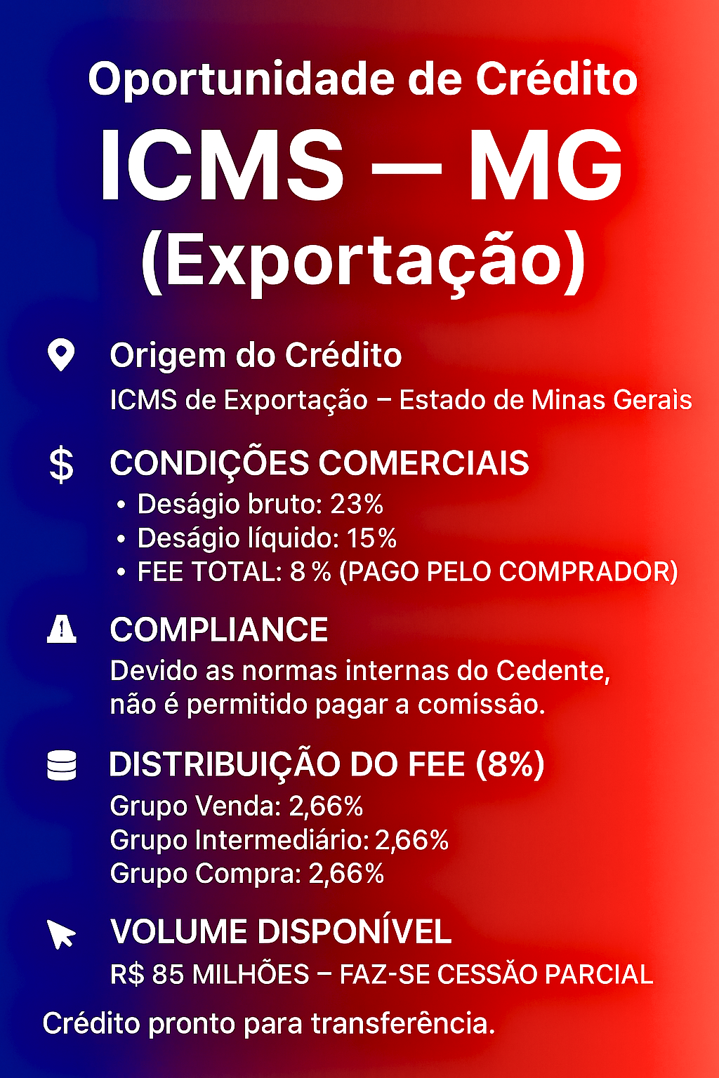 Operamos com créditos de ICMS São Paulo, Minas Gerais, Paraná, Santa Catarina e Rio Grande do Sul, com presença também em outras regiões do país, sempre em conformidade com a legislação vigente de cada estado.