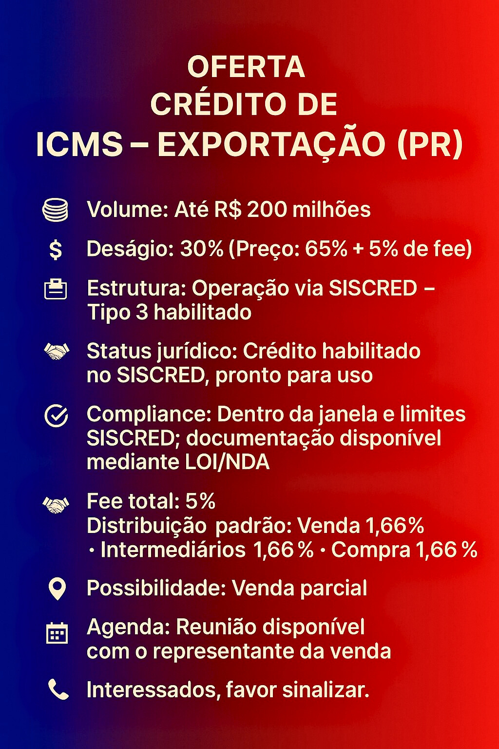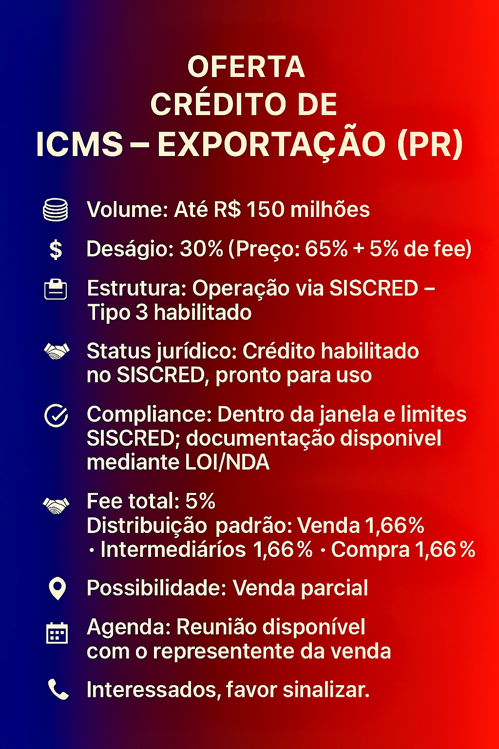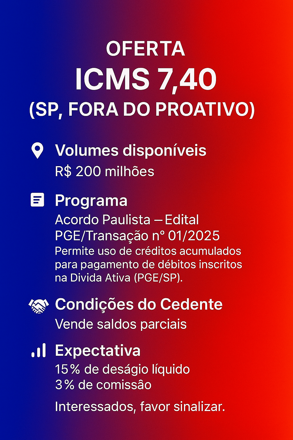 Operamos com créditos de ICMS São Paulo, Minas Gerais, Paraná, Santa Catarina e Rio Grande do Sul, com presença também em outras regiões do país, sempre em conformidade com a legislação vigente de cada estado.